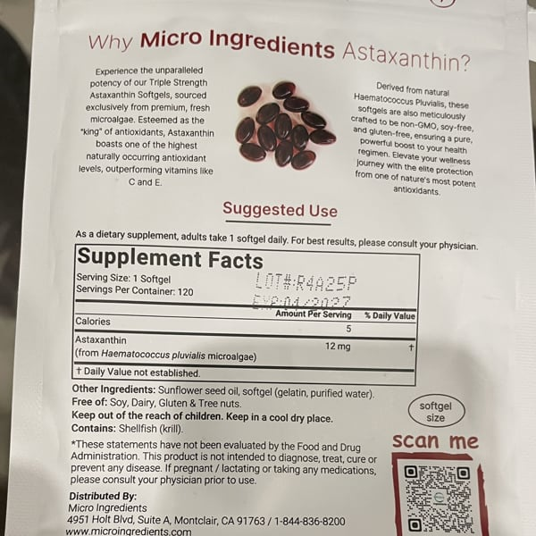 Unlike vitamins that break down in your stomach, Astaxanthin crosses the blood-brain barrier and reaches your eyes, skin cells, and joints. It's also 6,000x more powerful than Vitamin C.